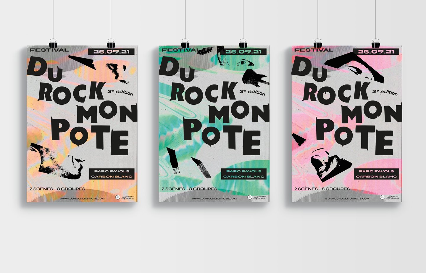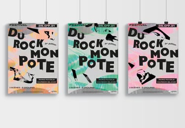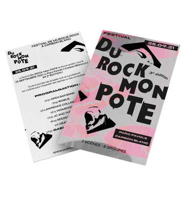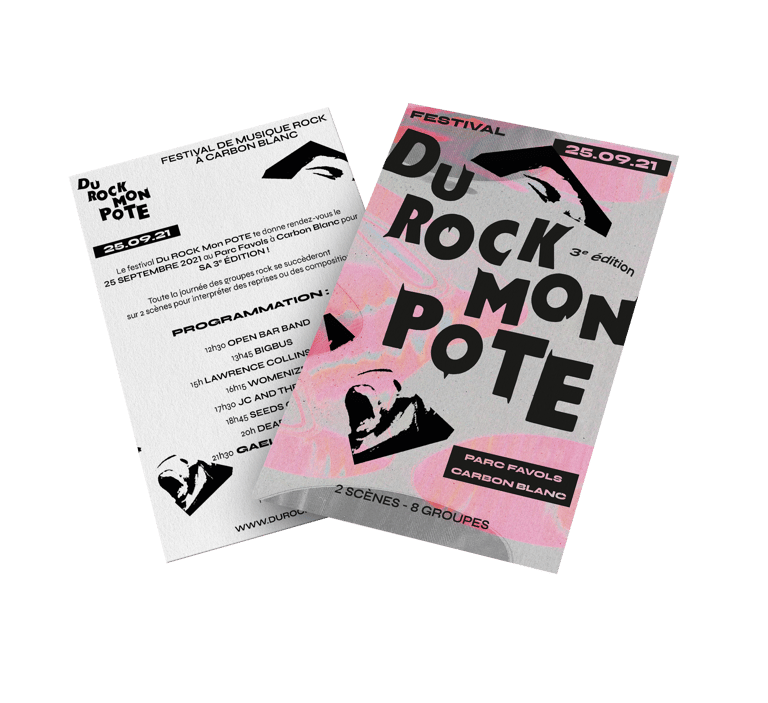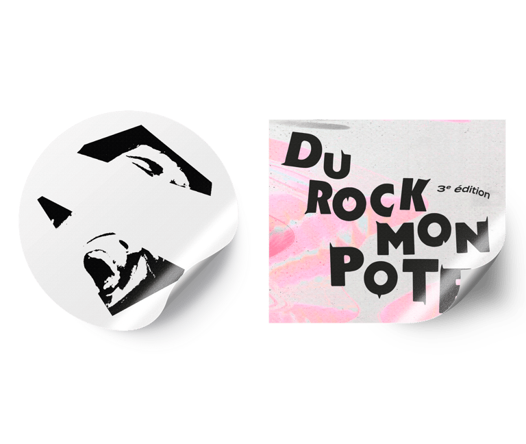 Pour donner un nouvel élan au festival Du Rock Mon Pote, dédié aux groupes de rock amateurs, le concept de l’identité visuelle s’appuie sur l’idée de renouvellement : celui du rock qui a évolué en de nombreux styles et celui du festival qui met chaque année en lumière de nouveaux talents.